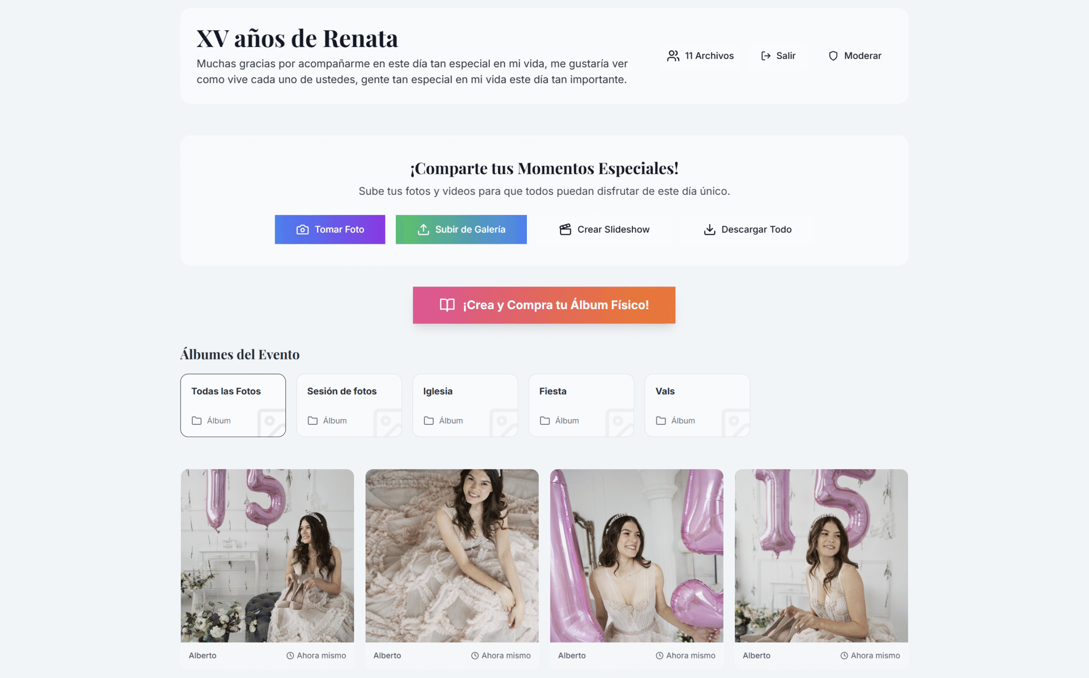 En Espacios Festivos, creemos que los momentos más especiales de tu vida merecen ser atesorados para siempre. Nuestras soluciones digitales están diseñadas para que cada risa, cada baile y cada emoción no solo se vivan, sino que se capturen, compartan y se conviertan en un legado digital. Desde conectar a tus seres queridos que están lejos hasta crear un álbum que habla por sí mismo, nos dedicamos a que tu celebración sea perfecta de inicio a fin… ¡y más allá!